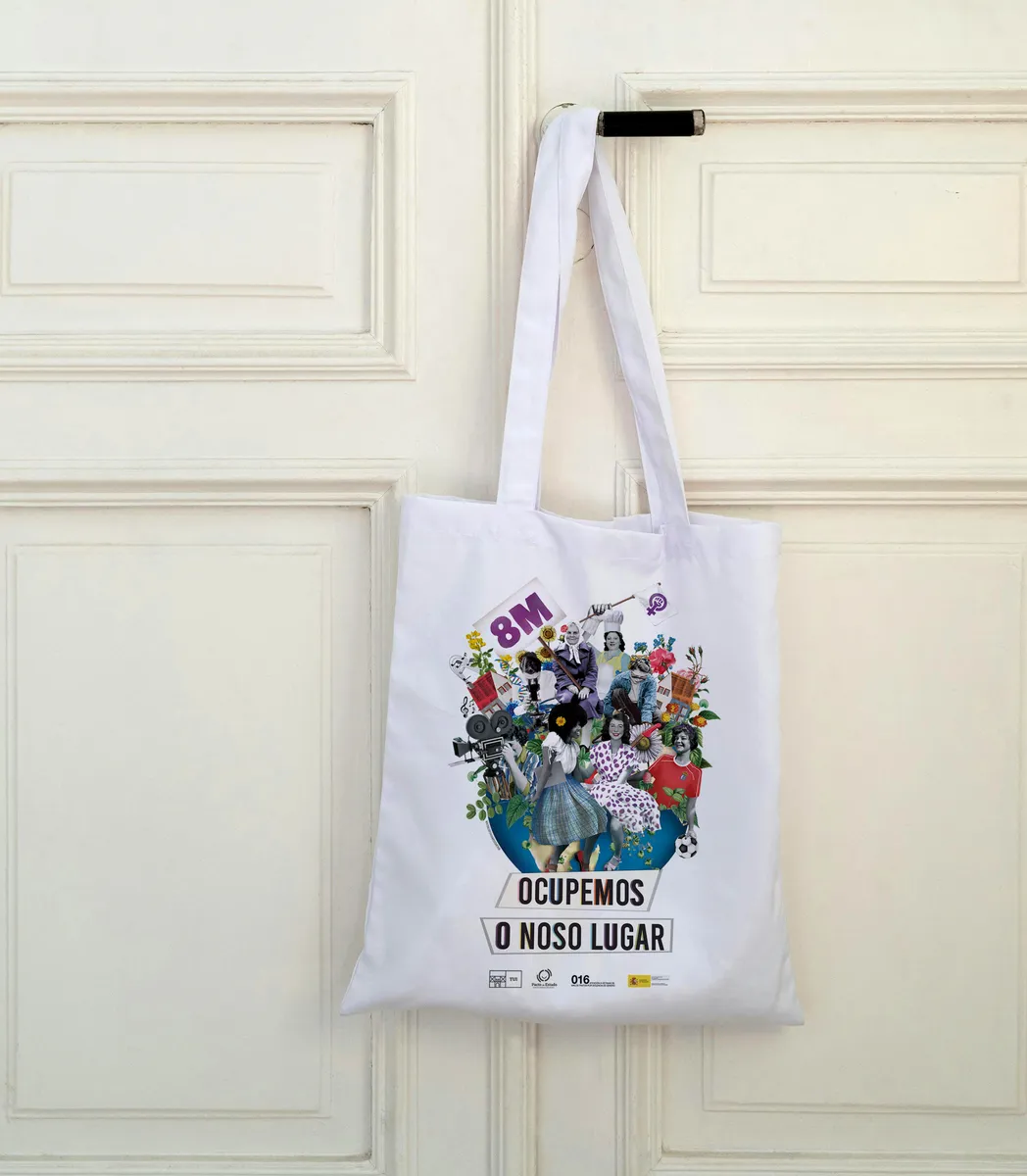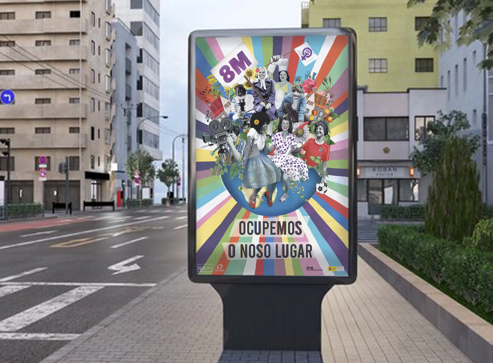 Campaña del 8M para el Ayuntamiento de Tui, Pontevedra 2023.  La campaña constó de conceptualización bajo el lema «Ocupemos o noso lugar», cartelería y variaciones para mupies, lonas, tote bags y chapas.