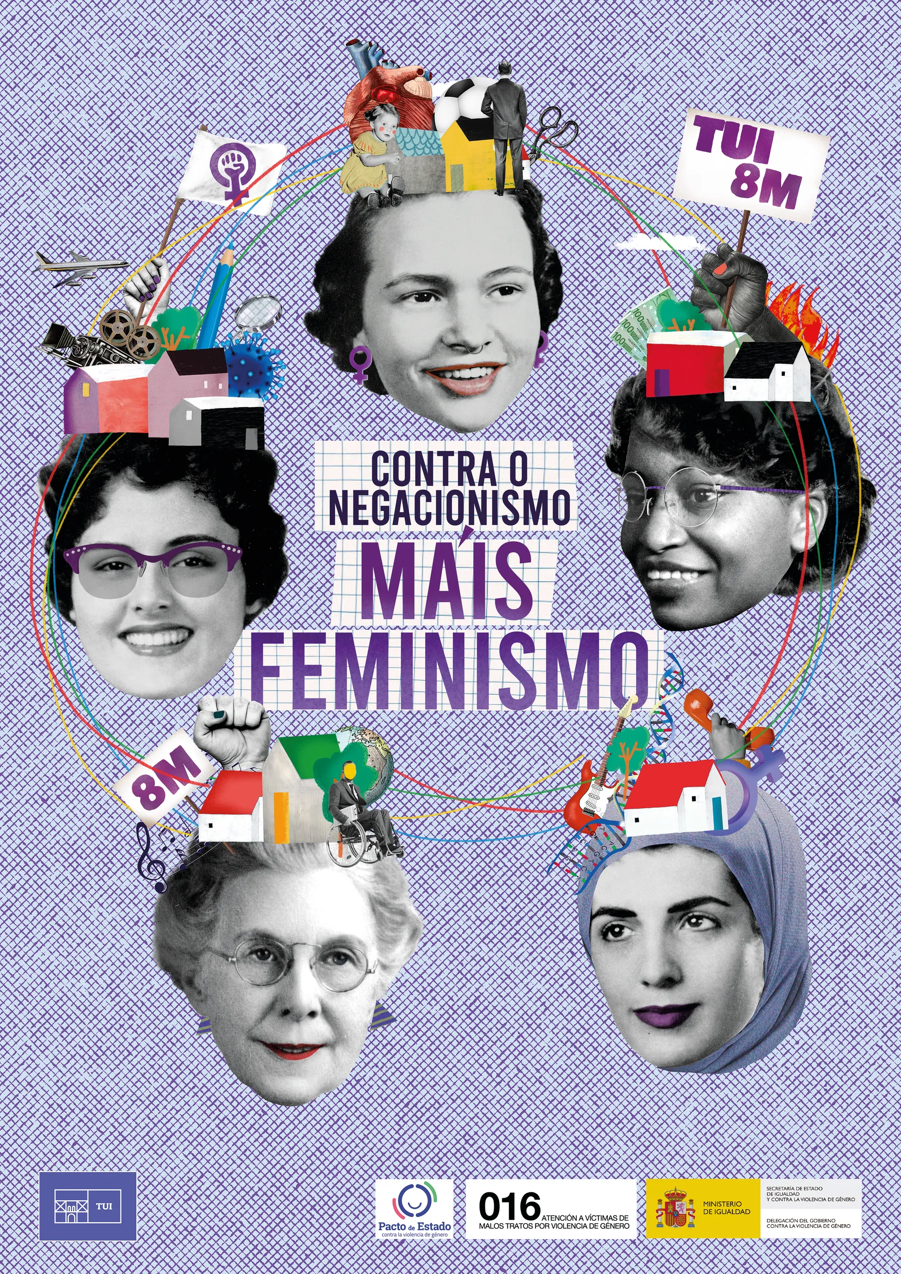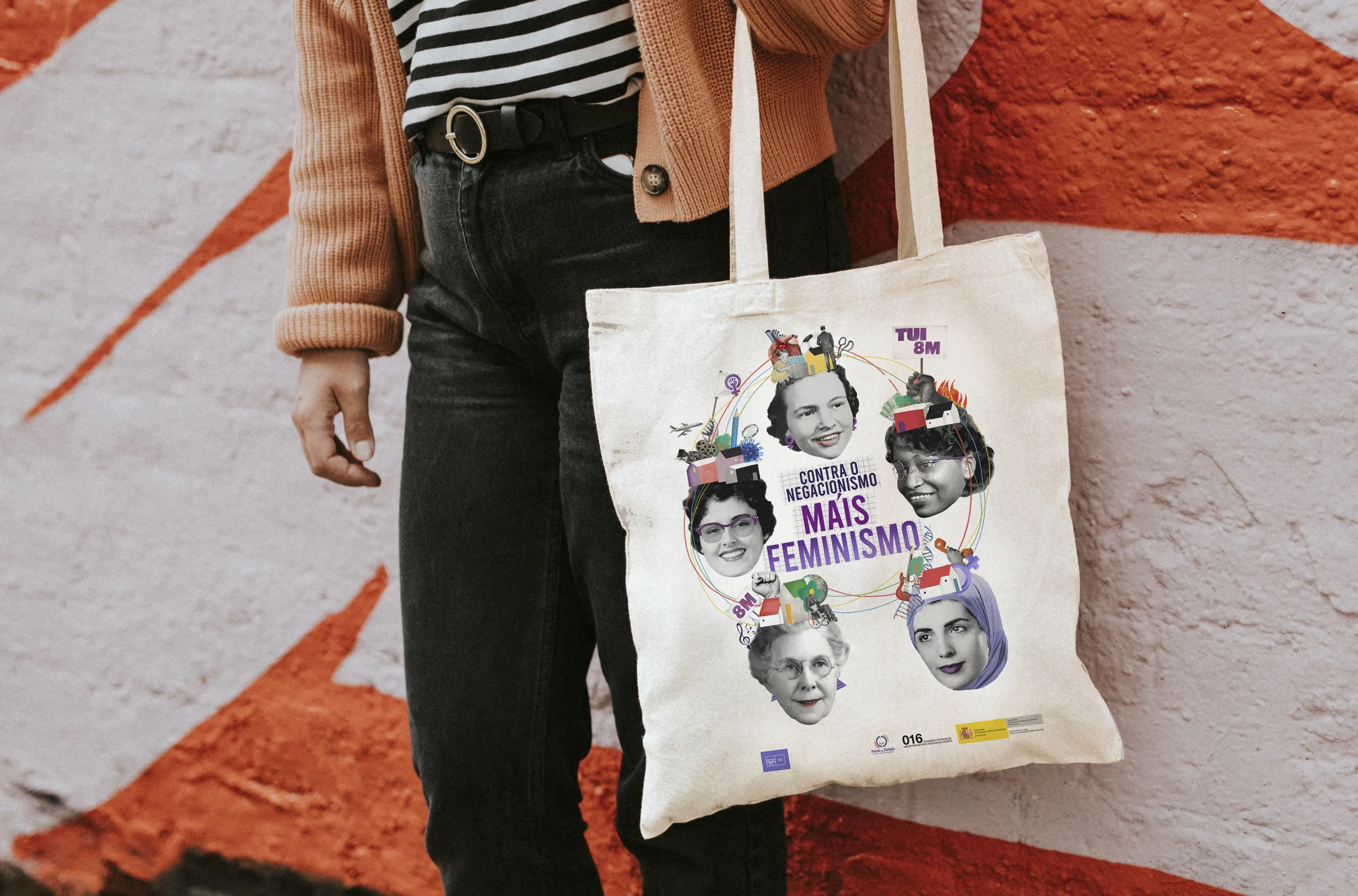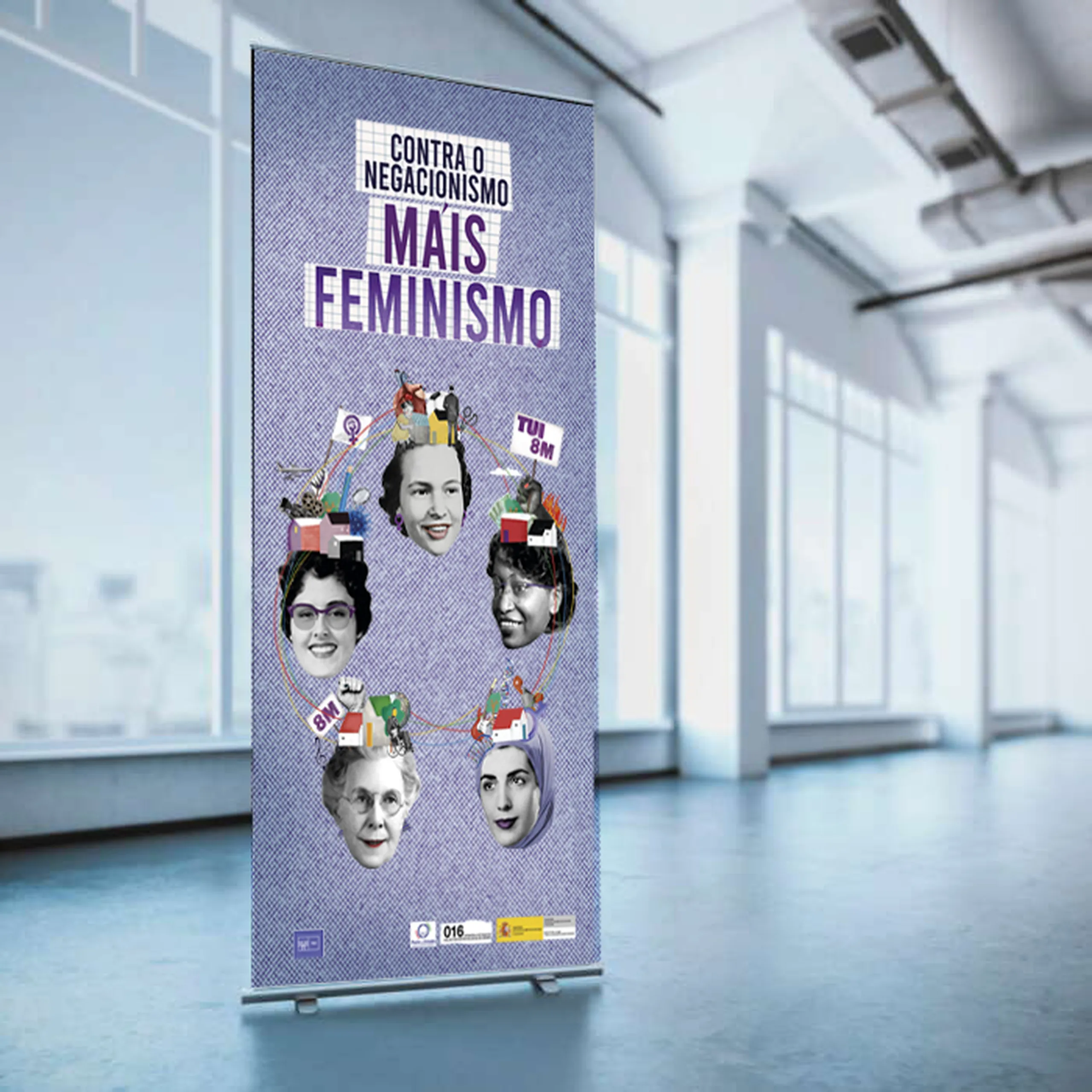 Campaña del 8M para el Ayuntamiento de Tui, Pontevedra 2024. La campaña constó de conceptualización bajo el lema “Contra o negacionismo, máis feminismo”, cartelería y variaciones para mupies, lonas, tote bags y chapas.
