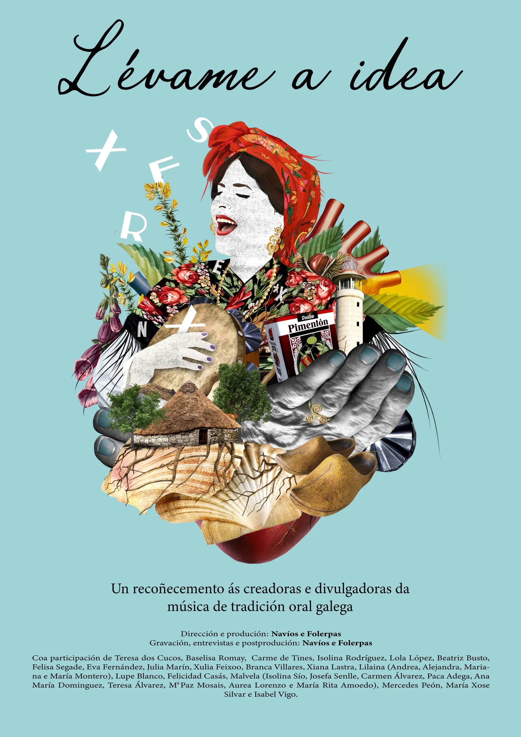 Cartel para la película documental “Lévame a idea” de la cooperativa gallega Navíos e Folerpas estrenada en 2025. Esta maravillosa y necesaria producción es, según sus propias autoras, “un reconocimiento profundo y necesario a las mujeres, auténticas protagonistas en la creación, recuperación y divulgación de la música de tradición oral y la poesía popular gallega”.