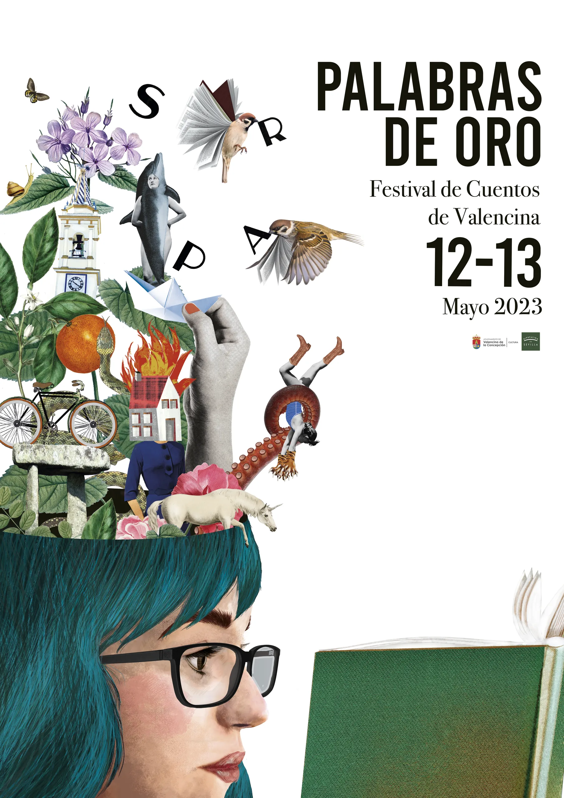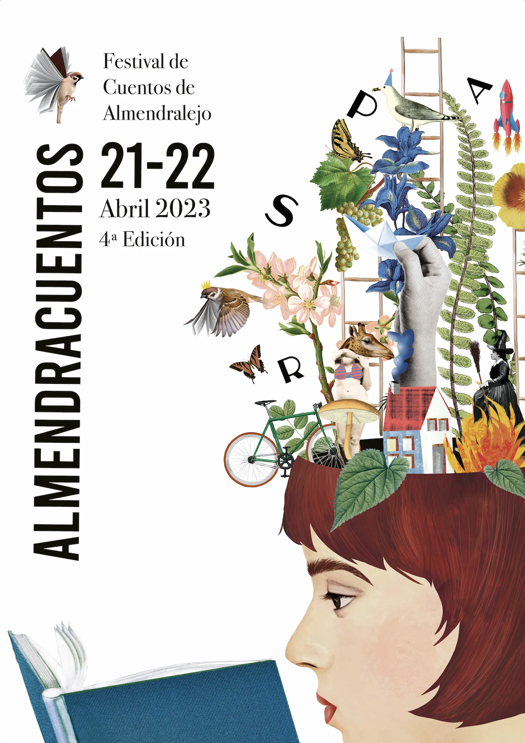 Cartelería para tres festivales de cuentos organizados en 2023 por Almendracuentos, espacio estable para la narración oral de cuentos: Festival de cuentos de Almendralejo “Almendracuentos”, “El viejo Cuento” de Lora del Río y “Palabras de oro” en Valencina.